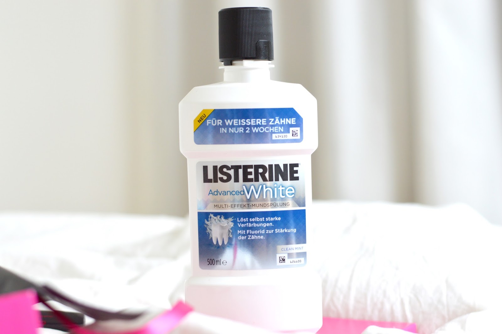 Das Listerine Mundspülwasser soll starke Verfärbungen in nur zwei Wochen lösen und hilft neue Verfärbungen der Zähne vorzubeugen. Ich werde es auf jeden Fall testen, denn zuvor hatte ich immer nur kleine Proben aus dem Drogeriemarkt. Ich bin gespannt auf das Ergebnis! (4,99€) Der Geschmack ist nicht zu scharf, sondern schön erfrischend.