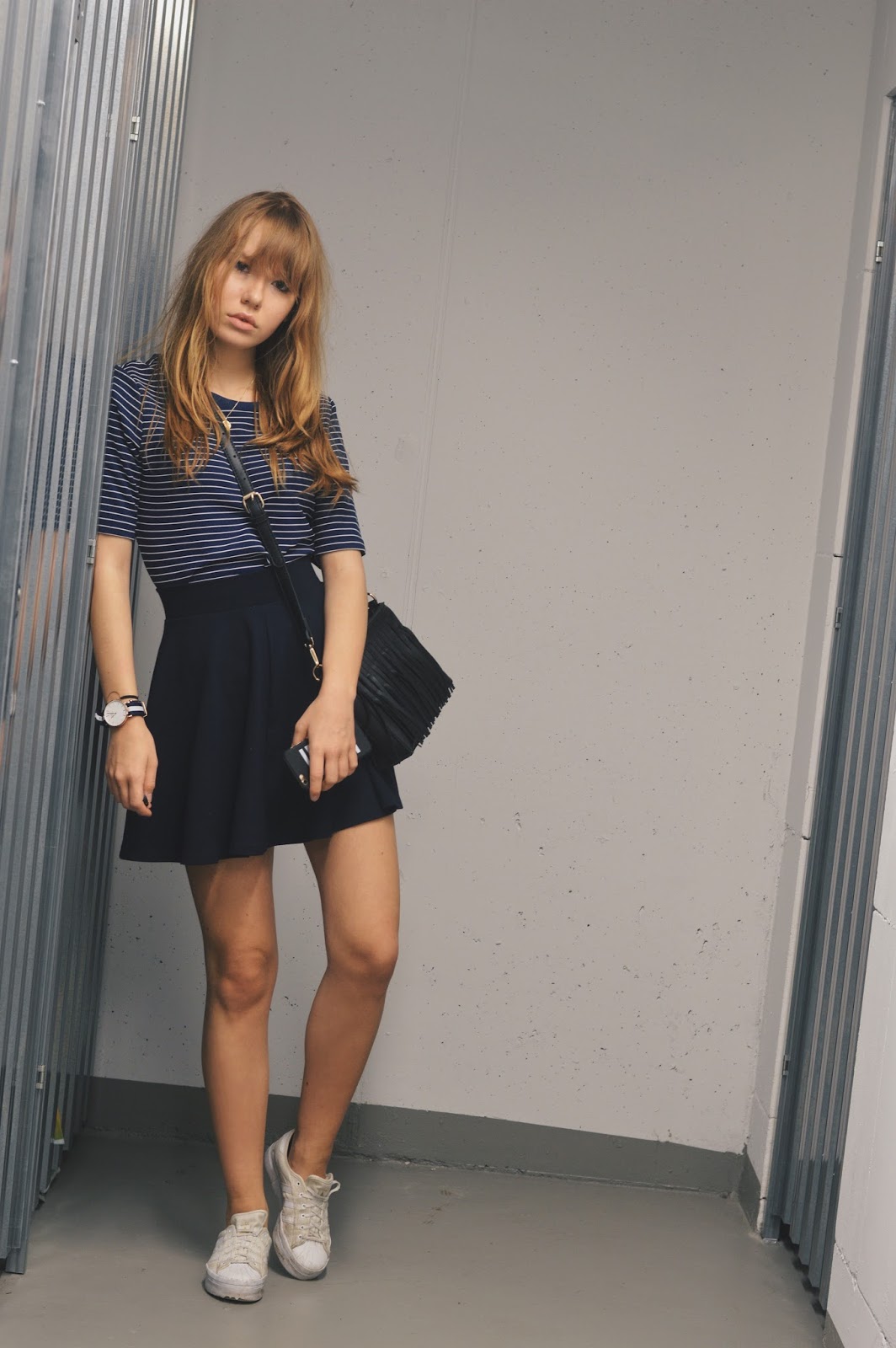 Mit dem gestreiften Kleid ging es mir ähnlich. Es passte leider nicht, aber warum nicht mit einem schicken Rock kombinieren? Meiner Meinung nach lässt sich das Kleid so, nicht nur im Sommer, sondern auch im Herbst tragen. Auch mit einer süßen Strumpfhose könnte ich mir die Kombination sehr gut vorstellen. Ich habe es auf AboutYou entdeckt, denn dort gibt es eine große Auswahl an  Sommerkleidern. Das Kleid hat unter 25€ gekostet und bei so einem Preis konnte ich nicht widerstehen. Lässig dank der Sneaker und gleichzeitig elegant! Wer kann dazu schon „Nein!“ sagen?